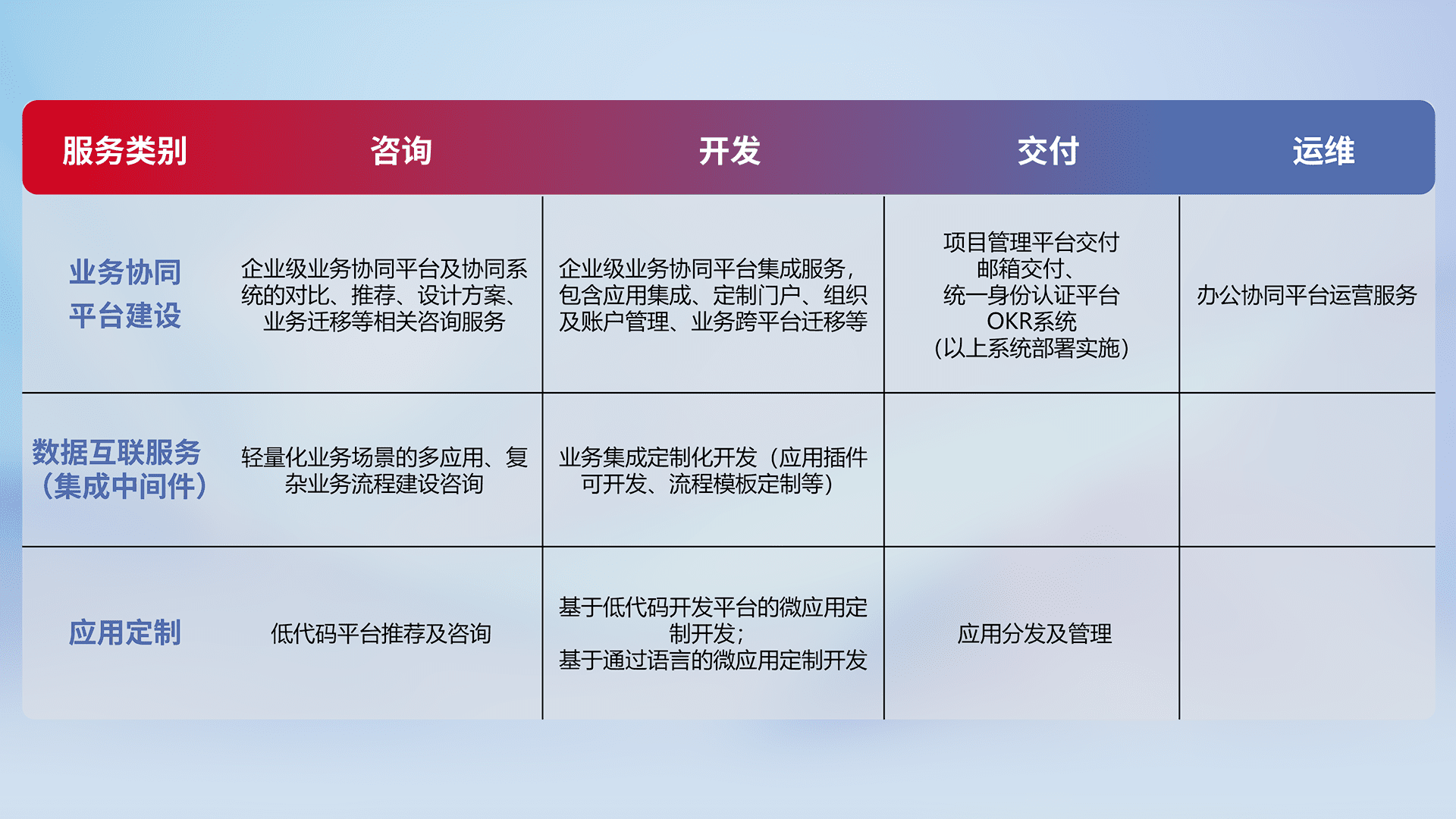 针对钉钉、、、、企微、、IDaas等平台级产品提供产品的规划、、方案、、、交付、、、定制化开发等服务,,,实现如统一协同办公、、、、智能客户服务、、、混合会议管理、、智能数据查询、、、、等业务场景,,,实现数字化转型。。
