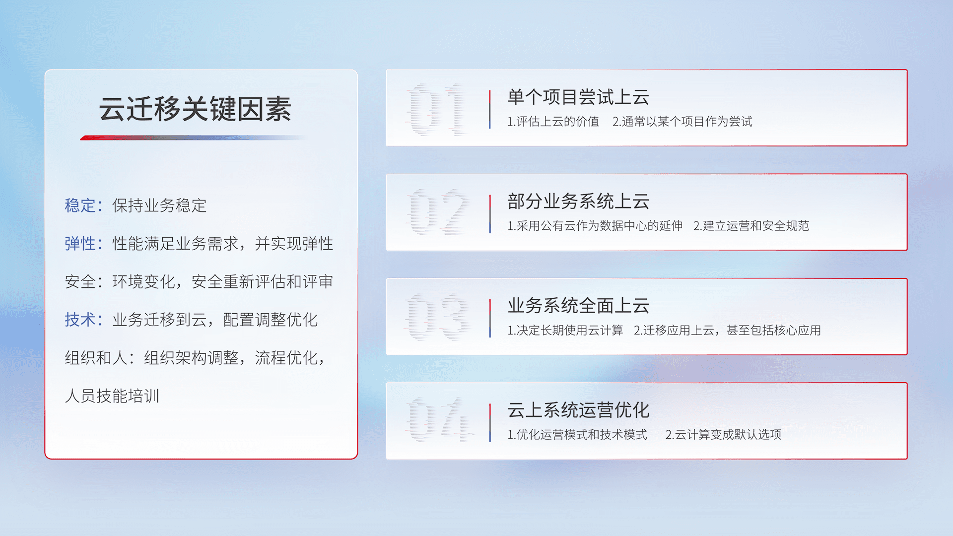 结合实际业务,,,,从规划设计、、、、云平台选型、、、、云原生改造、、数据迁移、、、集成交付,,,迁移全过程为客户识别最佳上云路径,,做好风险识别管理,,设计网络架构、、身份权限、、、、安全审计合规、、、操作审计、、、、日志审计、、、监控告警策略、、、多站点容灾设计等,,对云上基础设施进行整体规划,,提升IT治理水平,,以满足弹性、、、、高可用、、高性能的需求。。