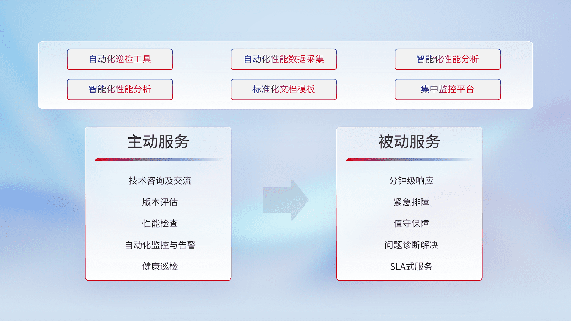 智能化工具和标准化文档,,,,保障服务质量,,提供主动服务(包含技术咨询、、、、版本评估、、、、性能检查、、、、自动化监控与告警、、、健康巡检)和被动服务包含(分钟级响应、、紧急排障、、值守保障、、、、问题诊断解决、、、SLA服务)。。。。